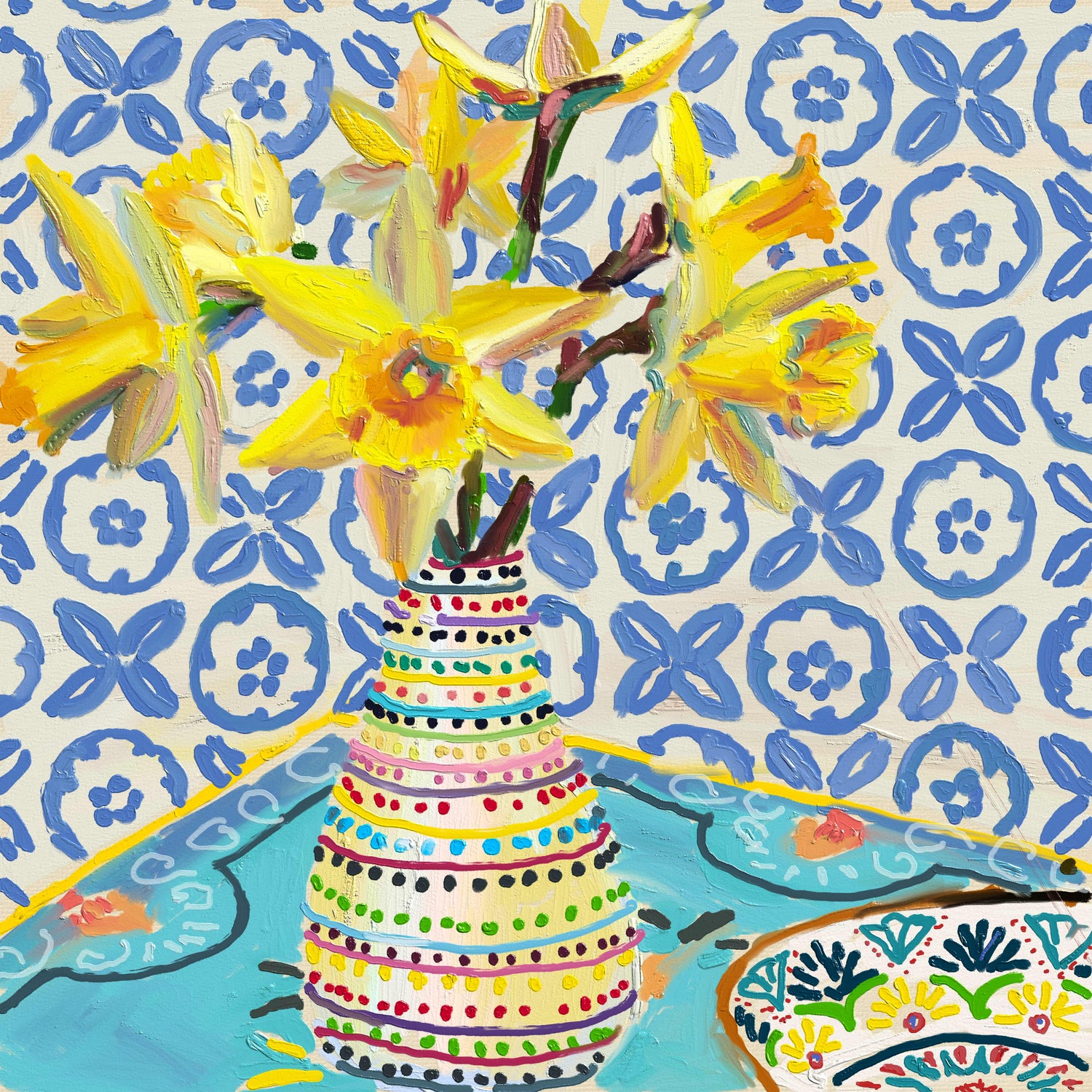 View AllI manipulate the scene to design new and exciting interiors. Collecting furniture, vases, flowers from photographs and online to invent my own narrative. I then paint with oils on an ipad to create the colourful artwork.