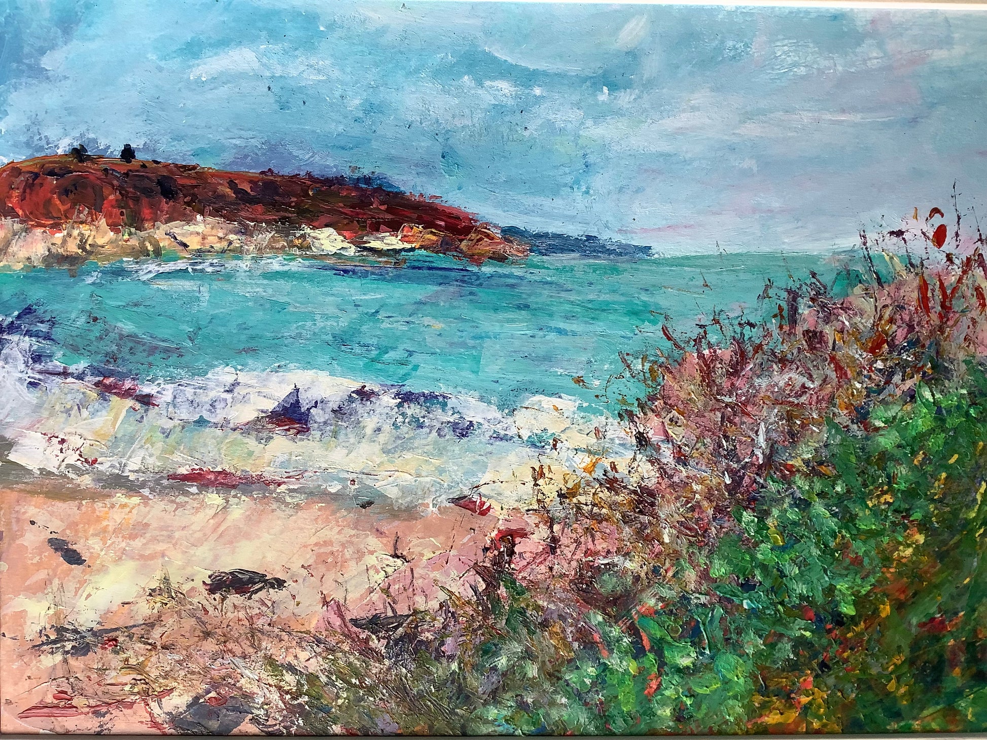Autumn Beach offers a painterly exploration of Maenporth beach in Cornwall, capturing the autumnal light as it imparts striking turquoise tones to the sea. Crafted with a palette knife and sticks, this piece features spontaneous brushstrokes that evoke a strong sense of place.