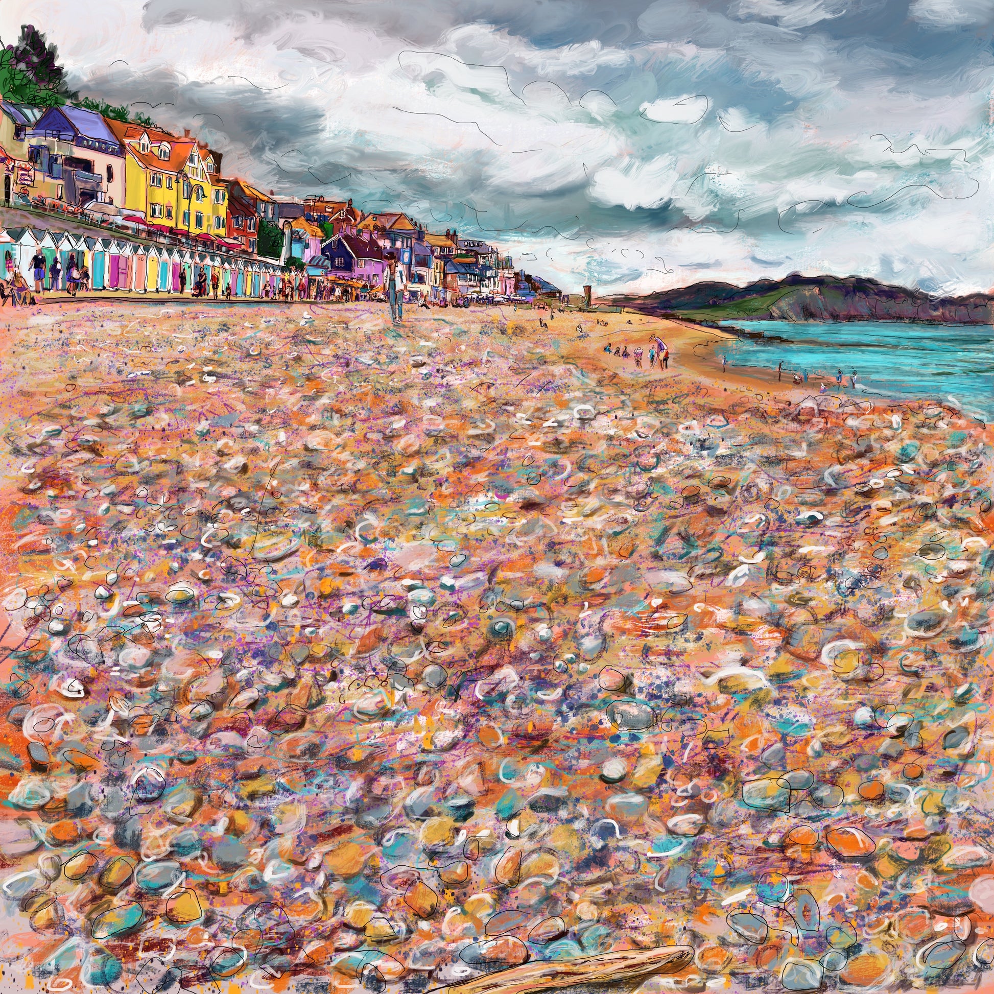 A view from sitting on the beach at Lyme Regis with colourful beach huts.